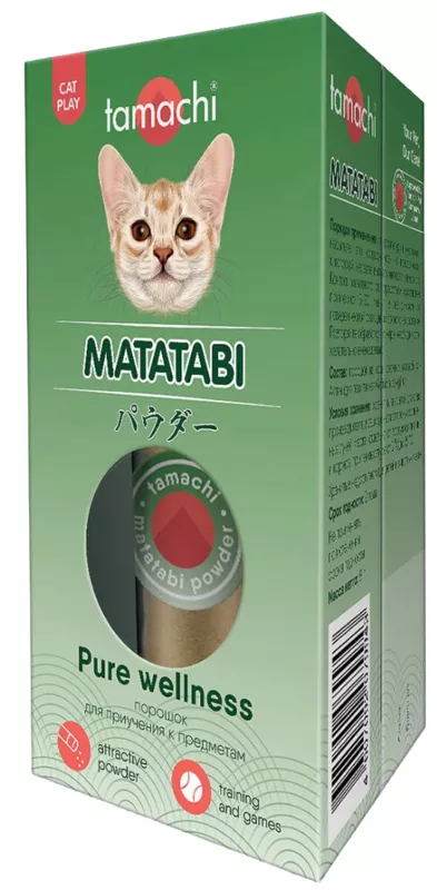 Порошок Мататаби — универсальное средство для продолжительных игр и поднятия настроения кошки. Не вызывает перевозбуждения нервной системы и повышенной агрессивности. Подходит для приучения к когтеточкам, лежанкам и переноскам. Снимает стресс, повышает психоэмоциональный и физический тонус питомца. Так же способствует решению проблемы ожирения кошек, стимулируя их к активным играм.