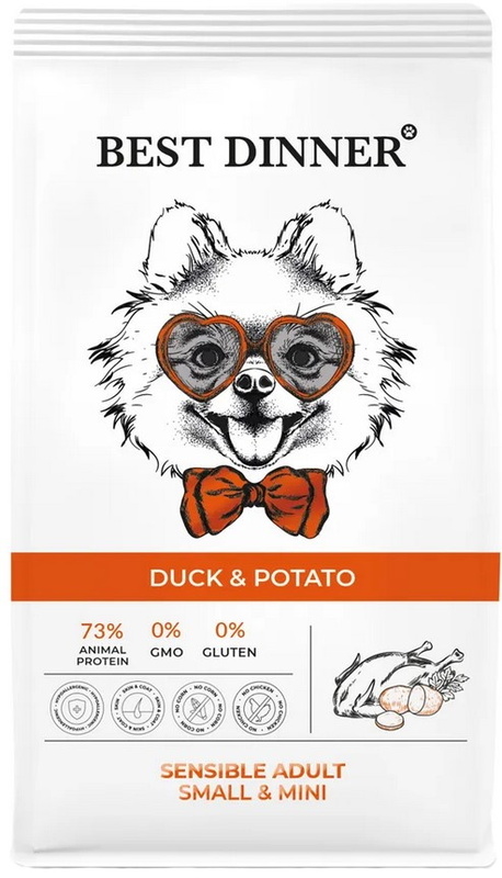 Высококачественный полнорационный корм для собак мелких пород Best Dinner с с уткой и картофелем создан специально для собак с особыми потребностями. Нежное мясо утки обладает отличной усвояемостью и подходит для собак склонных к аллергическим реакциям и проблемами с пищеварением. Юкка Шидигера способствует улучшению пищеварения. Экстракт бархатцев поможет в снятии воспалений с чувствительной пищеварительной системы.