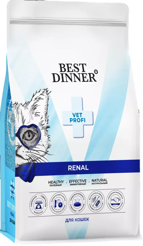 Полнорационный диетический сухой корм для взрослых кошек Бест Диннер Ренал предназначенный для поддержания функции почек при острых или хронических почечных заболеваниях.