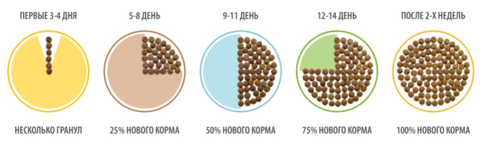 Важно: при вводе нового корма смешайте его небольшое количество с привычной едой и в течение нескольких дней постепенно увеличивайте количество нового корма. Следуйте рекомендациям по ежедневному питанию, представленным в таблице. Количество корма может меняться в зависимости от таких факторов, как возраст и уровень активности.