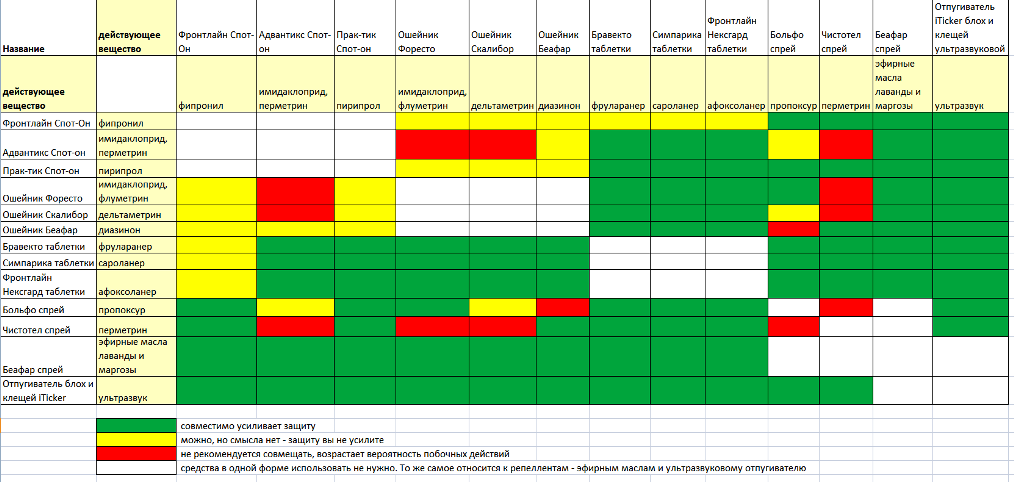 Помните, что ни одно средство не дает стопроцентной защиты от наружных паразитов. Лучше комбинировать разные препараты. Например, на собаку, обработанную каплями надеть противоблошиный ошейник или обработать инсектоакарицидным спреем непосредственно перед выездом за город. При этом важно выбирать средства с разными активными веществами. Что с чем можно и нельзя совмещать, смотрите в нашей таблице.
