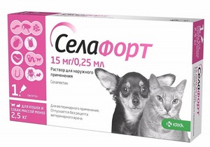 Есть в наличииДоставим сегодня Селафорт инсекто-акарицидные капли для щенков и котят с 6 месячного возраста, миниатюрных собак и кошек. Аналог Стронгхолда. Вес животного: менее 2,5 кг. Цена за упаковку. Объем: 0,25 мл. Количество действующего вещества: 15 мг.