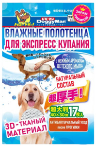 Нет в наличии Влажные полотенца для средних и крупных пород собак. Фасовка: 17 штук. Размер: 40*30 см.