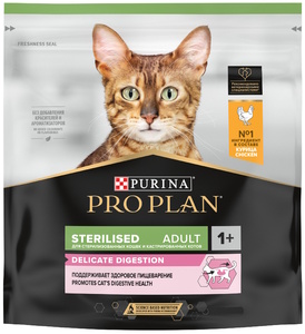 Доставим сегодня Сухой корм Про План для стерилизованных кошек и кастрированных котов с чувствительным пищеварением. Фасовка: 0,4кг, 0,4+0,2кг 1,5кг, 1,9кг, 3кг. Вкус: курица.