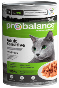 Нет в наличии Консервированный корм ПроБаланс для взрослых кошек с чувствительным пищеварением или склонных к аллергии. Фасовка: 415 г.