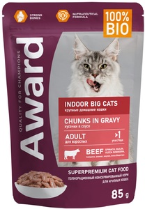 Влажный корм Award Indoor для кошек крупных пород кусочки в соусе с говядиной, Авард