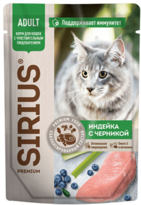 Sirius для взрослых кошек чувствительным пищеварением Индейка с черникой, Сириус