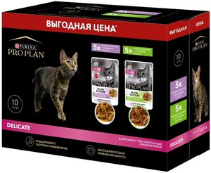 Нет в наличии ПроПлан Пауч для кошек с чувствительным пищеварением. Фасовка: 10 штук по 85 г. Вкус: индейка, ягненок.
