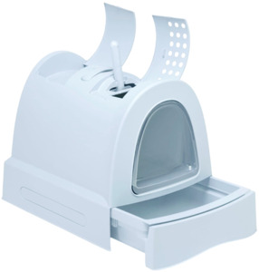 - Закрытый домик – отличный вариант для стеснительных особей и хозяев, чувствительных к запахам. Как правило, закрытый домик снабжен дополнительным угольным фильтром, поглощающим запахи.