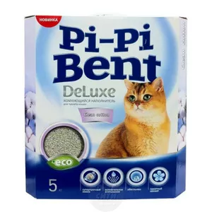 В сине-голубых тонах выполнена вторая линейка марки Pi-Pi Bent под названием Deluxe. Здесь представлены комкующиеся наполнители более высокого класса по техническим характеристикам. Это мелкая фракция и изысканный аромат. В линейке товаров представлены комкующийся Deluxe Classic, Deluxe Fresh Grass и Deluxe Clean cotton.