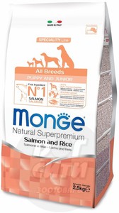 Нет в наличии Монж сухой корм для щенков всех пород (2-12 мес) с лососем и рисом. Фасовки: 2,5 кг, 12 кг.
