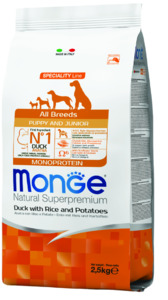 Нет в наличии Монж сухой корм для щенков всех пород (2-12 мес). Фасовки: 2,5 кг. Состав: с уткой, рисом и картофелем.