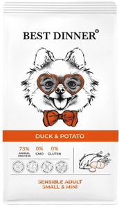 Нет в наличии Полнорационный сухой корм Бест Диннер для собак мелких пород склонных к аллергии и проблемам с пищеварением с уткой и картофелем. Фасовка: 1,5 кг.