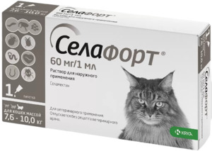 Есть в наличииДоставим сегодня Селафорт инсекто-акарицидные капли для кошек, аналог Стронгхолда. Вес: 2,6-7,5 кг, 7,6-10 кг. Объем пипетки: 0,75 мл, 1 мл. Количество действующего вещества: 45 мг, 60 мг.
