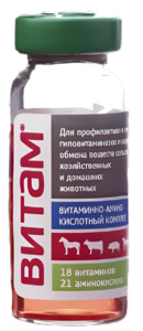 Доставим завтра Комплексный витаминно-аминокислотный препарат Витам для животных. Фасовка: 10 мл, 100 мл, 450 мл.