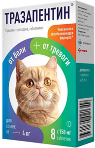 454 +5 Тразапентин для кошек Есть в наличииДоставим завтраВ корзину Препарат для кошек в составе комплексной терапии для улучшения качества жизни при хронических заболеваниях, сопровождающихся болью и ухудшением эмоционального состояния.
