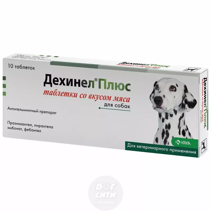 Одна таблетка Дехинел плюс со вкусом мяса рассчитана на дачу животному весом 10 кг. Для этого она содержит 150 мг фебантела, 144 мг пирантела эмбоната и 50 мг празиквантела. При массе тела менее можно использовать часть таблетки, выше — комбинацию нескольких таблеток.