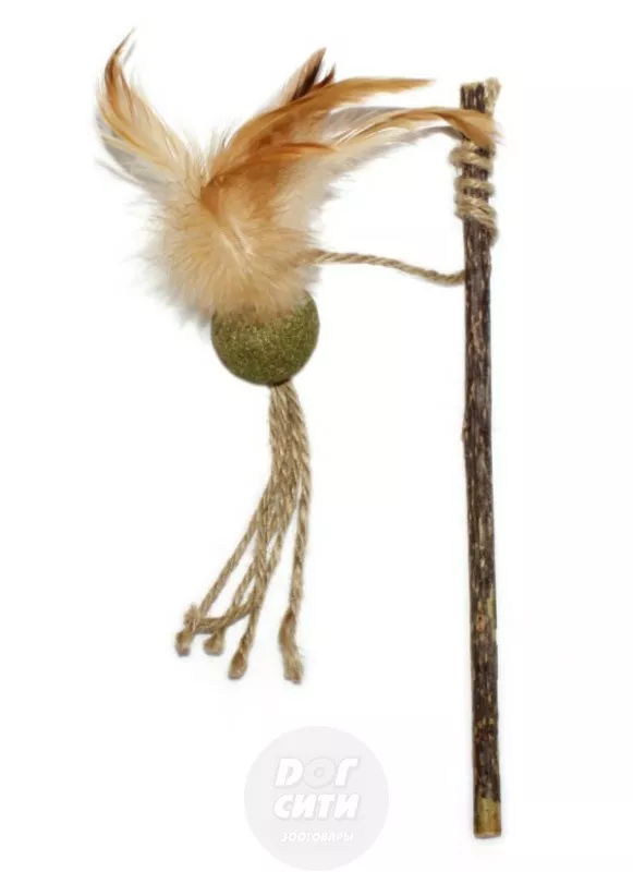 Изделие представляет собой палочку из высокогорного вереска с мячиком из прессованной кошачей мяты с натуральными перьями и бубенчиком внутри, активирующимся при касании. Такой вид игрушек весьма привлекателен для кошек - он пробуждает в них инстинкт хищника. Что поможет развить мускулатуру и реакцию кошки, а также удовлетворит её охотничий инстинкт.