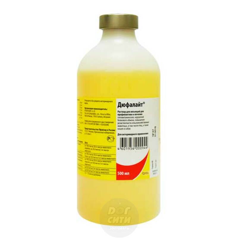 Препарат, попадая в кровеносную систему, очень быстро усваивается организмом и начинает свое восстановительное действие. Дюфалайт совместим с другими лекарственными средствами и кормами. Обычно он хорошо переносится и не вызывает побочных эффектов, но возможна индивидуальная реакция.