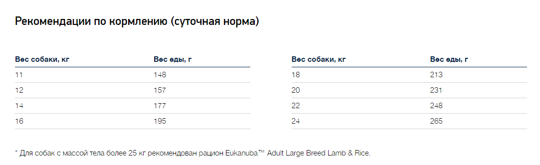 Переход: при переходе на корм Eukanuba постепенно вводите его в рацион собаки в течение 4 дней. Мы рекомендуем кормить вашу собаку 2 раза в день. Разделите дневную норму, указанную в таблице, на количество кормлений в день. Придерживайтесь рекомендуемых норм кормления, индивидуальная норма кормления вашей собаки зависит от ее возраста, условий содержания, темперамента и активности.