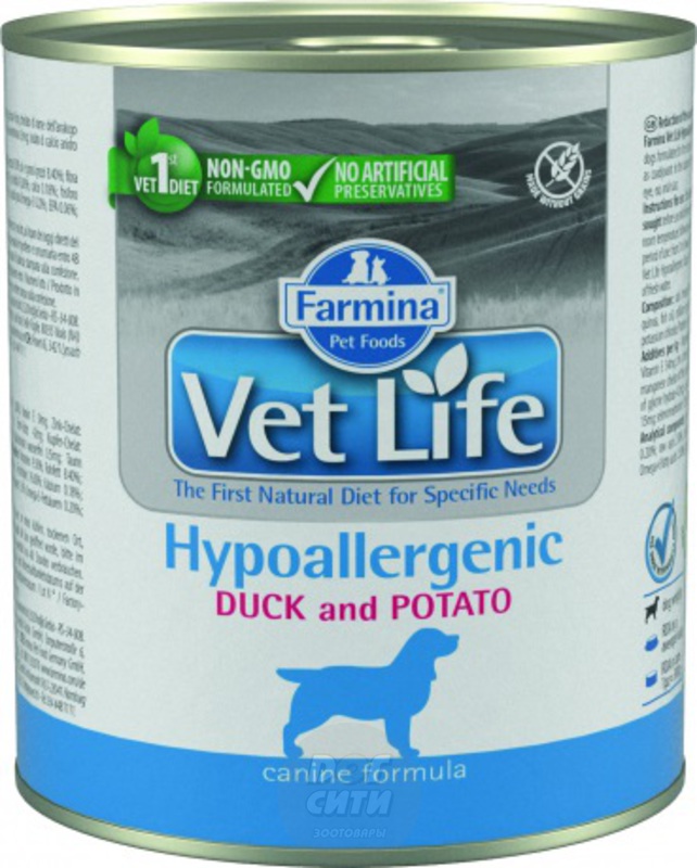 Farmina Vet Life Hypoallergenic Duck & Potato – полнорационный диетический влажный корм для собак, страдающих пищевой аллергией или пищевой непереносимостью. Также рекомендован как вспомогательное средство для улучшения трофических функции кожи и ее производных: глаз, ушей, параанальных желёз.