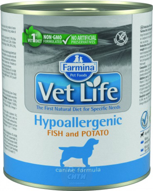Farmina Vet Life Hypoallergenic Fish & Potato – полнорационный диетический влажный корм для собак, страдающих пищевой аллергией или пищевой непереносимостью. Также рекомендован как вспомогательное средство для улучшения трофических функции кожи и ее производных: глаз, ушей, параанальных желёз.