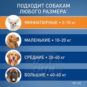 - подходит для взрослых особей и щенков от 2 месяцев с весом от 2 кг;