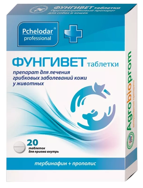 Препарат Фунгивет таблетки предназначен для лечения дерматомикозов у животных (собак и кошек). Препарат применяют для лечения грибковых заболеваний кожи, волос, когтей и слизистых оболочек, вызванных дерматофитами: трихофития и микроспория, а также кандидоза, вызванного дрожжеподобными грибами Malassezia furfur и Candida albicans.