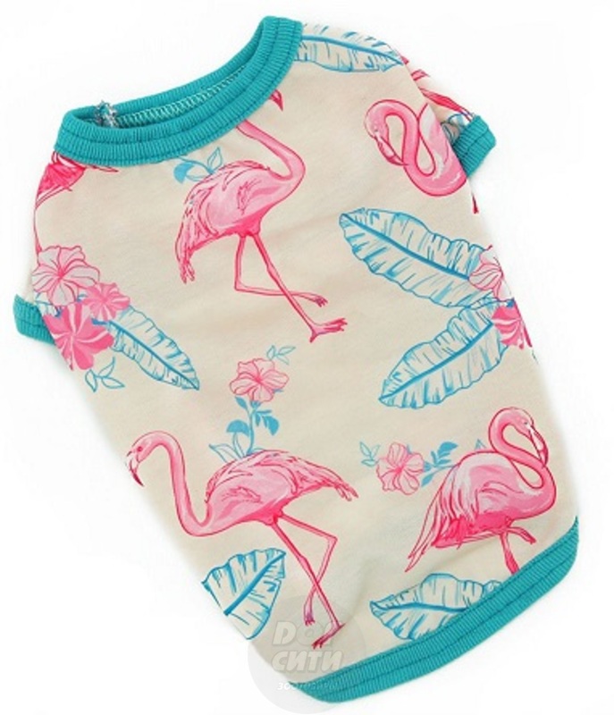 Мягкая футболочка защитит вашего питомца от палящих солнечных лучей и пыли и добавит ему очарования. Красивая футболка из смесового трикотажного полотна с забавным принтом "Фламинго", хорошо пропускает воздух, подходит для собак мелких пород. На поясе резинка для более плотного прилегания.