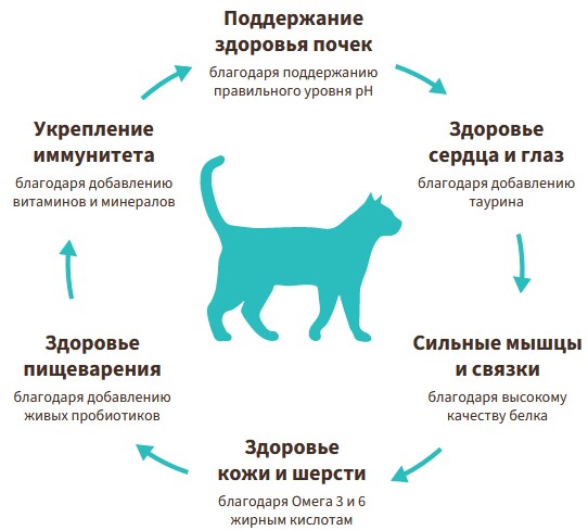 Живые пробиотики и пребиотики: один миллиард живых пробиотиков на 1 кг помогают поддерживать здоровье пищеварительной системы, кожи, шерсти и иммунитета.