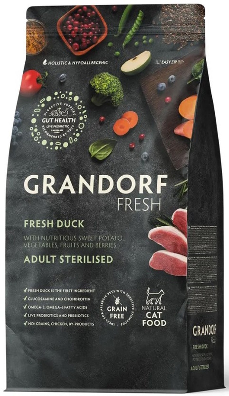 Grandorf Fresh Cat Утка с бататом для стерилизованных кошек, Грандорф Беззерновой корм с живыми пробиотиками