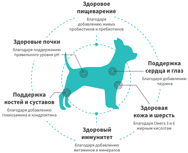 - живые пробиотики: корм содержит один миллиард живых и полезных пробиотиков на один килограмм корма. Пробиотики поддерживают микрофлору кишечника, помогают усвоению питательных веществ и укрепляют иммунитет. Пробиотики добавляются после производства в специальных кишечнорастворимых микрокапсулах, остаются живыми и выполняют свои функции;