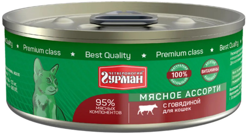 Четвероногий гурман “Мясное ассорти” для кошек – это влажный корм премиум класса с фаршевой консистенцией. В его составе 95% мясных компонентов исключительно высшего качества. Рецептуры корма богаты ингредиентами – мясо и всевозможные субпродукты обеспечивают лакомый вкус, притягательный аромат, высокую питательность, а также насыщенный комплекс витаминов и минералов.