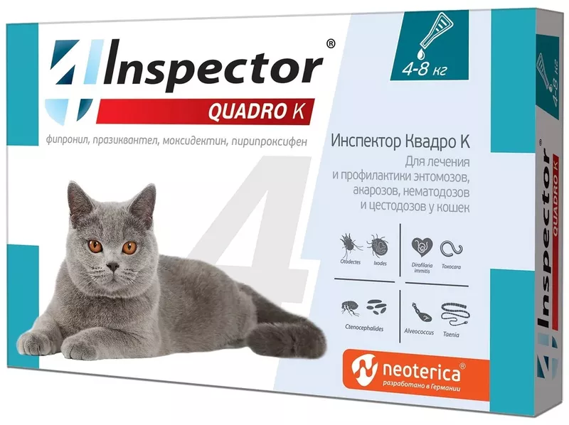 Очень удобно, когда можно одним препаратом убить сразу всех зайцев, то есть, паразитов. INSPEKTOR QUADRO K содержит активные вещества: