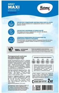 Ключевой ингредиент Karmy Maxi Adult — мясо индейки, которое считается самым диетическим из всех возможных, усвояемость белка из него составляет 95%. Помимо этого, оно богато рядом полезных микроэлементов, которые способствуют повышению активности головного мозга, поддерживают сердце и другие внутренние органы собаки. Также для производства полнорационного корма Karmy Maxi Adult использованы цельные злаки, растительная клетчатка и ряд других полезных компонентов. Полный список указан на пачке.