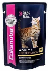 Нет в наличии Эукануба мясные кусочки в соусе для взрослых кошек. Фасовка: 85г.