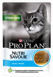 Нет в наличии Про План пауч для взрослых стерилизованных кошек. Объем: 85 г. Вкус: паштет с треской.