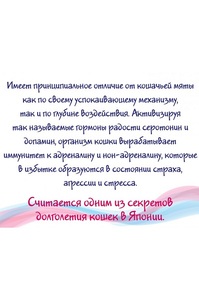 Мататаби - многофункциональный корректор поведения кошки, имеющий уникальное свойство стимулировать в ее организме выработку Допамина и Серотонина - гормонов, отвещающих за релакс, радость и удовольствие.