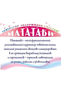 Мататаби рекомендуется для кошек и котов, испытывающих сильный стресс в окружении большого количества кошек. Благодаря приему мататаби вырабатывается гормон, отвечающий за радость и релакс, тем самым делая счастливыми и спокойными, во избежание стычек и конфликтов между ними. Многофункциональный успокаивающий корректор поведения кошки, имеющий уникальное свойство стимулировать в ее организме выработку допамина и серотонина - гормонов, отвечающих за релакс, радость и удовольствие. Берет свое начало от названия фермента мататаби, который вырабатывается в почках и плодах декоративной сливы, произрастающей на территории Японии. Имеет принципиальное отличие от кошачьей мяты как по своему успокаивающему механизму, так и по глубине и разнообразию воздействия.