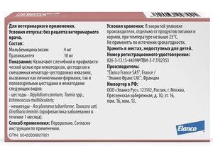 Количество действующего вещества: мильбемицин оксим 4 мг, 16 мг; празиквантел 10 мг, 40 мг.