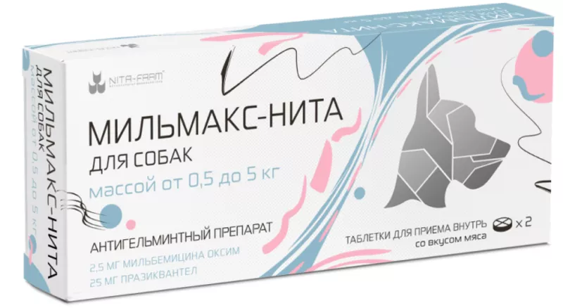 - Мильмакс-Нита для собак от 0,5 до 5 кг: 2,5 мг мильбемицина оксим, 25 мг празиквантел;