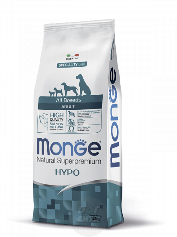 Monge Dog Speciality Hypoallergenic гипоаллергенный корм для собак всех пород лосось с тунцом - это полноценный сбалансированный рацион для взрослых собак, склонных к аллергическим реакциям и расстройствам пищеварения. Разработан на основе мяса рыб семейства лососевых, богат омега-3 и омега-6 жирными кислотами, которые позволяют предупредить воспалительные процессы и сохранить здоровье кожи и блеск шерсти вашего питомца.