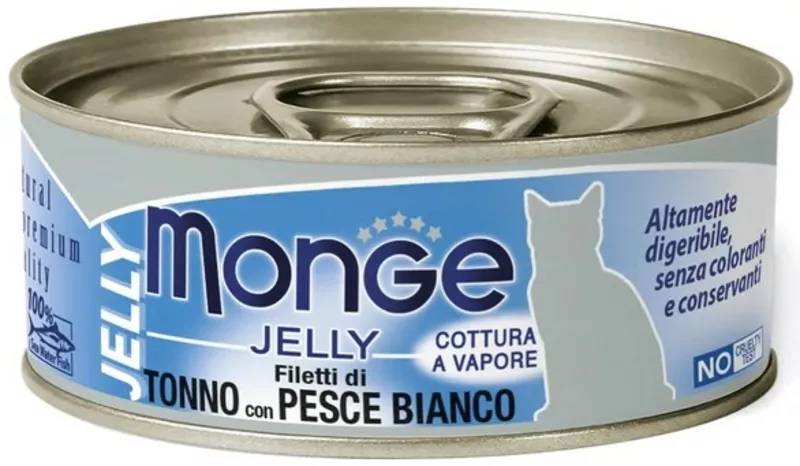 Дополнительное питание Monge Jelly для взрослых кошек, консервы из кусочков свежего тунца в аппетитном желе. Настоящий деликатес для четвероногих гурманов, приготовленный на пару из высококачественных продуктов.