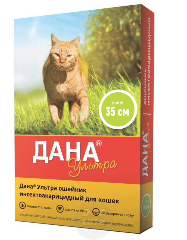Ошейник от блох для кошек Дана Ультра — полимерная лента, пропитанная специальным инсектоакарицидным составом. Постепенно выделяясь с поверхности ошейника, активные вещества убивают взрослых паразитов, их личинки и яйца, а также обеспечивают защиту от повторного нападения. Дана Ультра предназначена для решения проблем с: