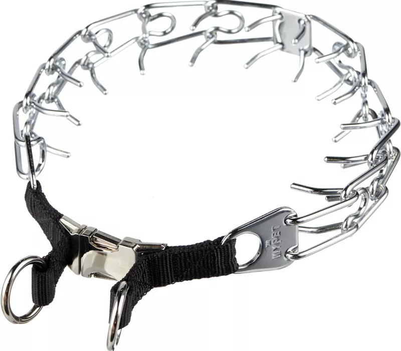 Звенья ошейника - гладкие с закругленными концами, покрыты хромом. Оснащен пряжкой для безопасного и быстрого одевания и снятия ошейника. Во избежание разрыва пряжки обязательно пристегивать ошейник одновременно за оба кольца.