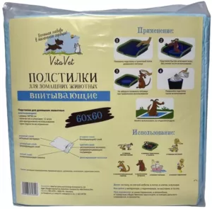 Впитывающие одноразовые подстилки Вита Вет для ухода за домашними животными с угольным фиьтром. Размеры: 60*40 см, 60*60 см, 60*90 см. По 1 штуке.