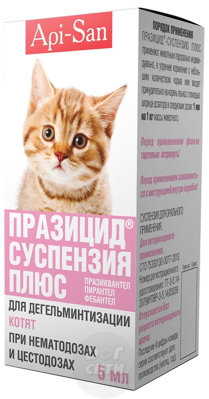 Котенок, пораженный гельминтами, всегда будет отличаться от здоровых собратьев. Он будет ослаблен и склонен к болезням. К тому же глисты — это прямое противопоказание к вакцинации. Обработка от внутренних паразитов очень важна и должна проводиться своевременно. Празицид суспензия плюс — удобный вариант для котят, который можно купить в Дог Сити. А когда питомец станет взрослым, можно обратить внимание на препараты для взрослых кошек, например, антигельминтик в таблетках от компании Apicenna.