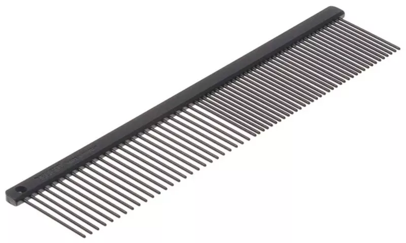 Комбинированная расческа с редкими и более частыми металлическими зубчиками в прочном стальном корпусе с антистатическим покрытием предназначена для повседневного ухода за густой и длинной шерстью различных животных.