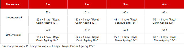 Нормы кормления рассчитываются по весу вашей кошки. Вы можете давать только сухой корм Роял Канин для кошек старше 12 лет или сочетать его с влажным кормом Royal Canin Ageing +12.
