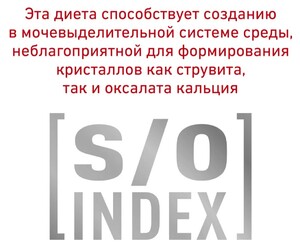 Эта диета способствует созданию в мочевыводящей системе среды, неблагоприятной для формирования как струвитных, так и оксалатных кристаллов (S/О INDEX).